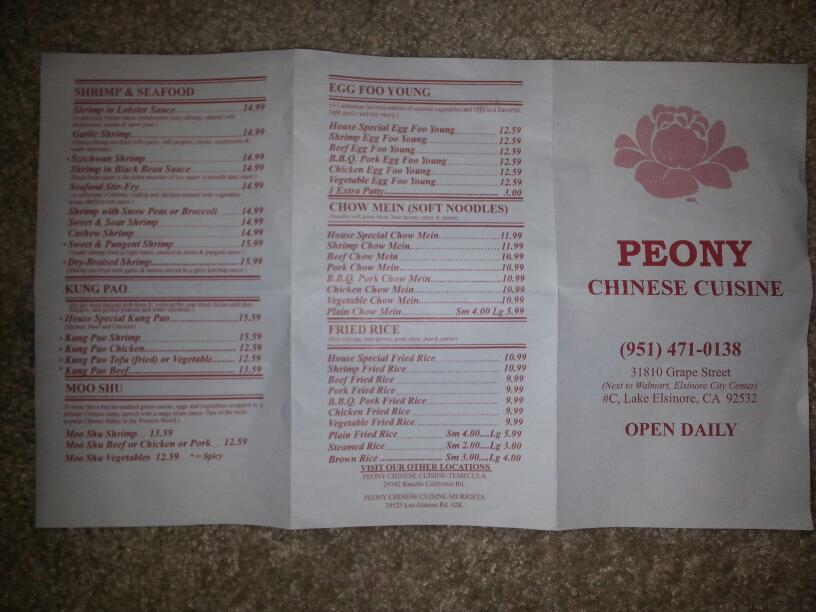 Welcome to Peony Chinese Cuisine, a delightful haven for Chinese food enthusiasts nestled in Lake Elsinore, CA. This charming restaurant is renowned for its welcoming atmosphere and exceptional service, ensuring every visit feels memorable. The moment you step in, you’re greeted with warm smiles from the staff, setting the tone for a delightful dining experience.
